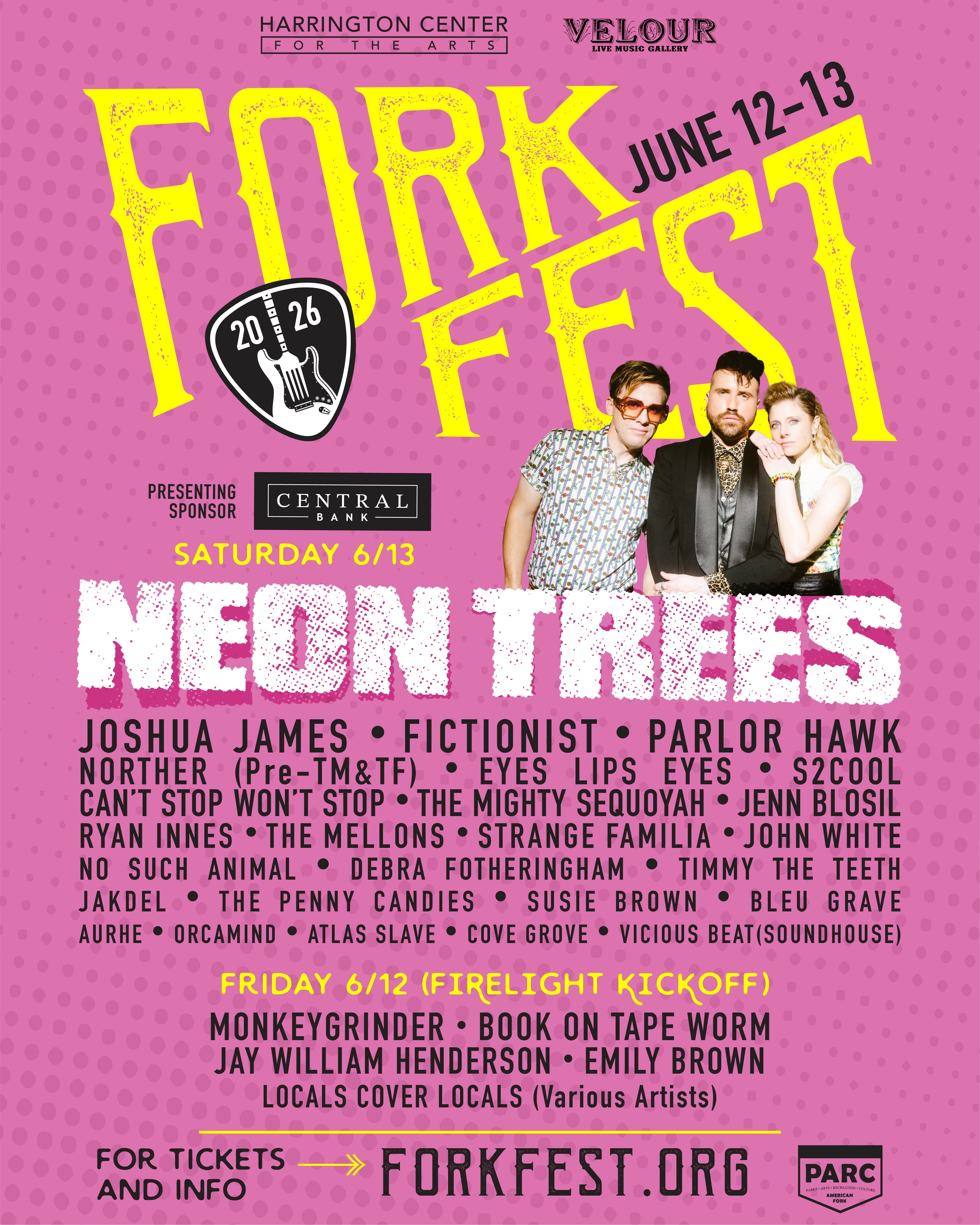 The premiere annual showcase of Utah bands presented by Harrington Center for the Arts and Velour Live Music Gallery. June 12-13, 2026 will bring thousands of patrons to American Fork’s Art Dye Park for two days of music acts with 32 bands across 3 stages–two large concert stages as well as a smaller, acoustic stage. The festival features numerous attractions with food trucks, art installations, a hammock hangout, bounce houses, and a vendor village with booths highlighting local artisans and craftsman.